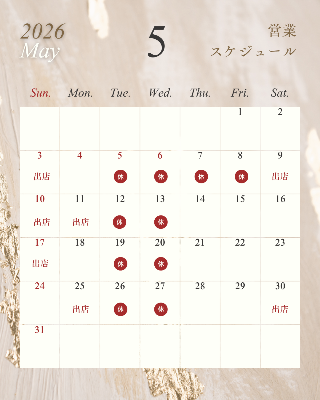 5月営業スケジュール お知らせ X Facebook はてブ LINE コピー 2026.03.25 5月は出店が多くなるため、早めにお知らせさせていただきます。 6月7月は店舗営業が多くなる予定です。 よろしくお願い致します。