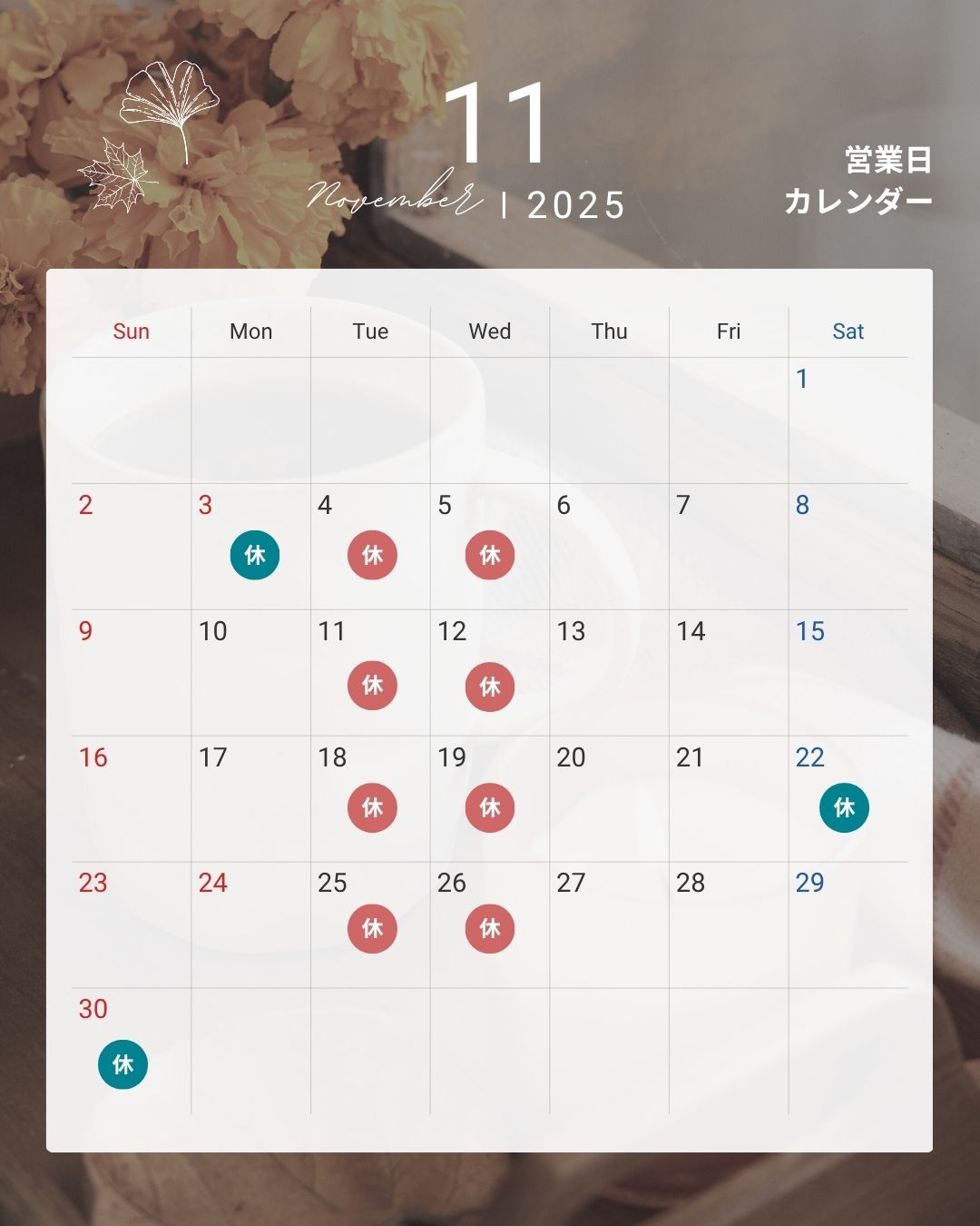 11月営業スケジュール お知らせ X Facebook はてブ LINE コピー 2025.10.29 以下はキッチンカー出店のためお休みとなります3日(月) 浜寺公園出店22日(土) 清明丘南小学校出店30日(日) セレッソ大阪ヤンマーレディース出店火曜日・水曜日は固定の定休日です。11月もよろしくお願い致します!
